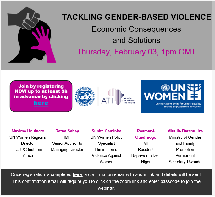 It is our pleasure to announce an upcoming webinar on ‘’Tackling Gender Based Violence (Economic Consequences and Solutions)’’ organized jointly by the IMF and UN Women. Register here: